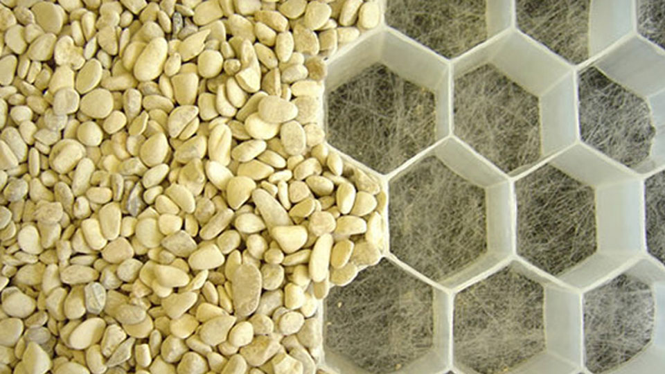 As placas Drenafix® são fabricadas em polipropileno extrudido com estrutura hexagonal oca (favo de mel), leves e resistentes à pressão. São recicláveis e revestidas na face inferior com geotêxtil poroso, que evita que as gravilhas se infiltrem no solo.